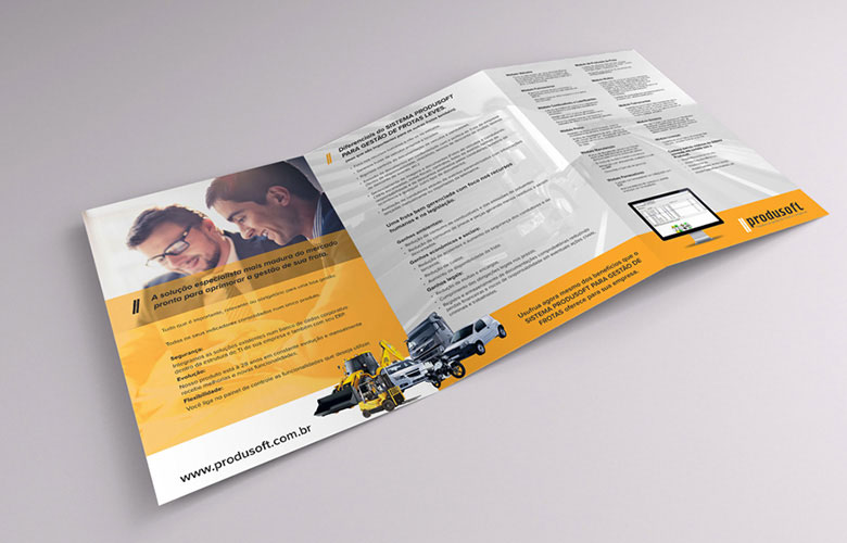 Neste projeto, desenvolvi o folder institucional da Produsoft, uma empresa especializada em soluções para gestão de frotas e transportes.